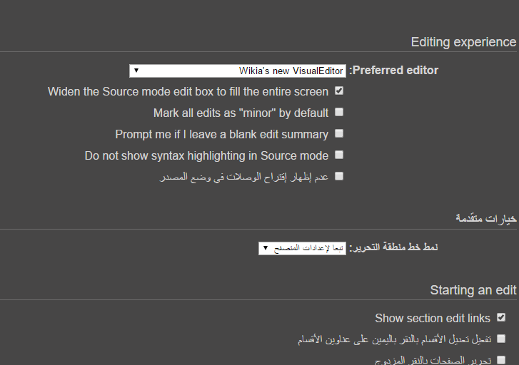 قسم "التحرير" في خاص:تفضيلات يحتوي على خيارات لإنشاء الصفحات: