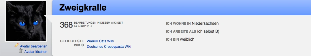Heute stellen wir euch einen neuen Wikianer vor. Zweigkralle ist erst seit ungefähr einem Jahr aktiv, aber in mehreren Wikias aktiv unterwegs. Unter anderem im Warrior Cats Wiki, im Warrior Cats Free Fantasy Wiki, Rs Warrior Cats Wiki und im Moviestarplanet Wiki. Es sieht fast so aus als könnte Zweigkralle ein Katzenfan sein. ;)