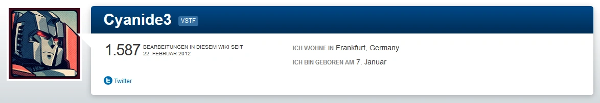Cyanide3: Mein Name in Wikia ist Cyanide3 (Spitznamen die sich draus entwickelt haben sind Cysi und Cy), wusele im Umkreis von Frankfurt am Main herum, studiere Chemie, während ich in meiner Freizeit (neben Wikia) Ingress spiele, sehr gerne lese, ins Kino gehe und ein Faible für Comics und Computerspiele entwickelt habe. Mein "Markenzeichen" ist die Kaffeetasse und meine regelrechte Sucht nach dem Heißgetränk. In Wikia wusele ich hier und da mal rum und suche gerne mal per Remix auf Wikia.com nach neuen Communities. Derzeitige Wikis sind jedoch das Mega Man Wikia und das Disney Wikia und das des Spiels Mordors Schatten.
