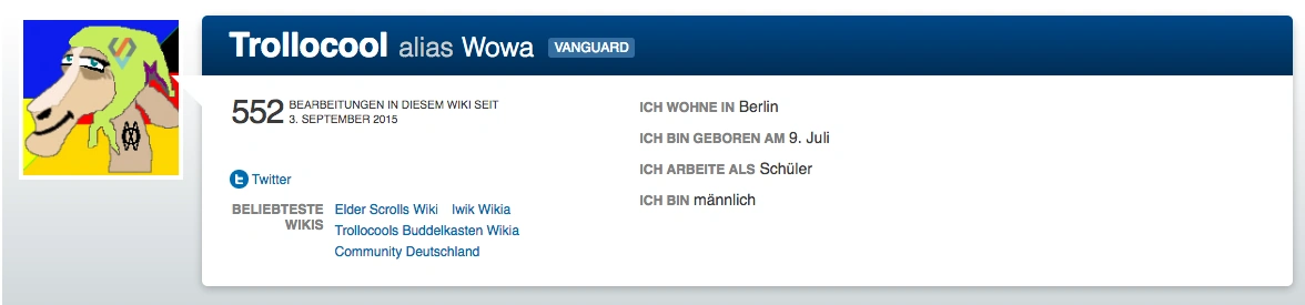 Hoi, ich bin Wowa, häufig auch Trollo genannt. Ich bin zurzeit 14, wohne in Berlin und bin ein begeisterter Wikiholic. Des Weiteren bin ich Teil des Teams der Portabilitäts-Pioniere, Chat-Moderator in der ComDE und bin bei Grammatik und Rechtschreibung viel zu pingelig. Das beste Tier der Welt ist natürlich die Ziege, weshalb ich auch eine als Profilbild habe (kein Lama und nein, das ist kein Lappen auf dem Kopf). Ich habe fortgeschrittene Kenntnisse in HTML und CSS, bringe nach einigen Fehlschlägen auch etwas in JavaScript zu Stande, außerdem beherrsche ich einige Programmiersprachen, die nicht für Webbrowser genutzt werden. Gebürtig bin ich Ukrainer, bin aber im Alter von 3 nach Deutschland gezogen, weshalb ich bilingual aufgewachsen bin und bis dato 6 Sprachen auf verschiedenen Niveaus sprechen kann.