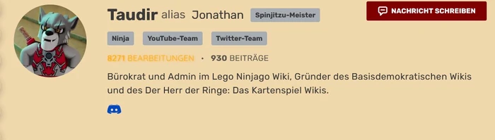 Taudir Ich glaube, ich war schon vorher einmal auf dem Herr-der-Ringe-Wiki von Fandom, aber mir war nicht wirklich bewusst, dass das alles eine große Plattform ist oder dass das alles von Fans gestaltete Seiten sind. Das Ninjago Wiki war wirklich meine erste echte Erfahrung im Fandom-Wiki-Bereich.
