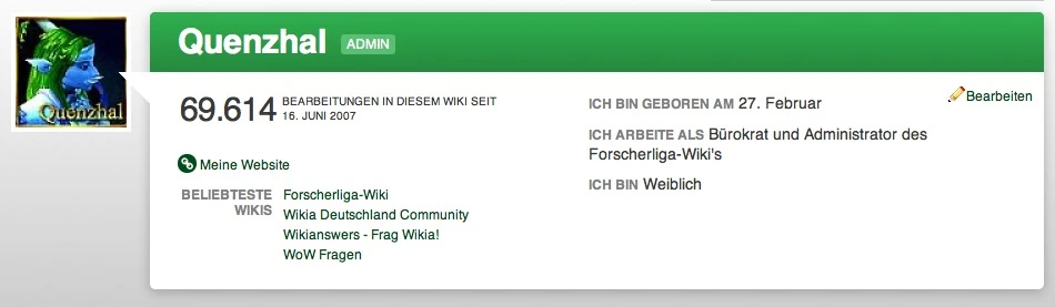 Quenzhal: Als „Benutzer:Mickie“ im Juni 2007 für unseren World of Warcraft-Server das Forscherliga-Wikia ins Leben rief, dachte ich mir: „Hey, das kommt genau richtig, damit ich meine WoW-Hintergrundsammlung mit anderen Spielern aus unserer Community teilen und mit Schwerpunkt auf die Rollenspiel-Aspekte ausbauen kann.“ Also meldete ich mich an und tippte drauf los, auch wenn alles noch neu und verwirrend war und ich so gut wie nichts über Richtlinien zum Schreiben von Beiträgen wusste.