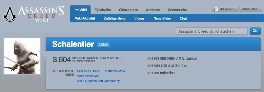 Heute wollen wir euch wieder einmal einen Wikianer vorstellen, und zwar dieses Mal Schalentier vom Assassins Creed-Wiki!