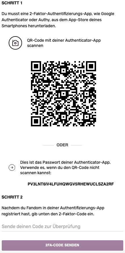 - Gehe zu Fandoms 2FA-Bildschirm und scanne den angezeigten QR-Code, oder gib den Authentifizierungsschlüssel ein