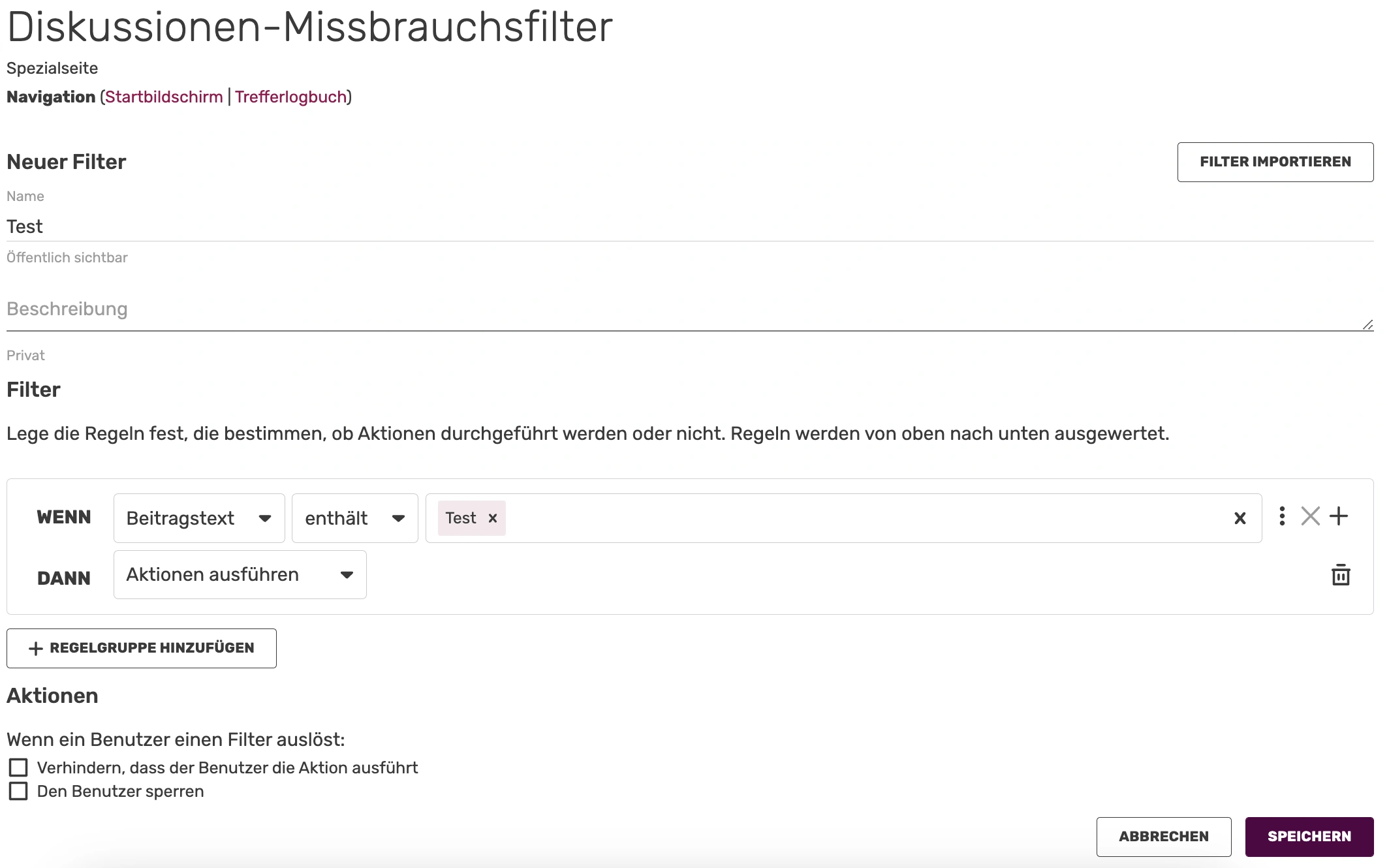 - Eine detaillierte Liste der Regeln und Aktionen findest du unter Hilfe:Diskussionen-Missbrauchsfilter/Regelformat.
