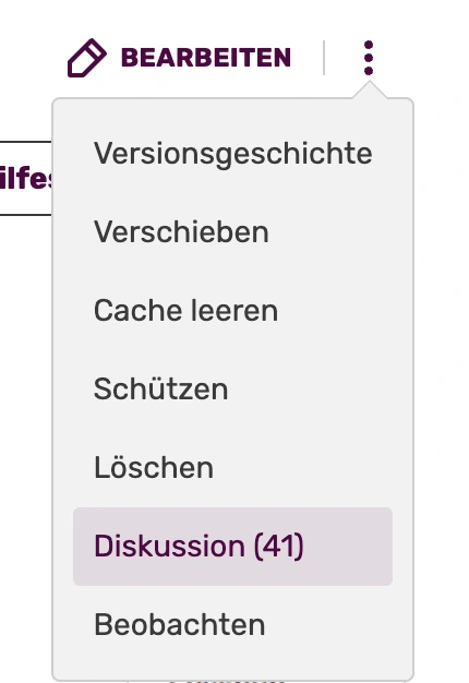 Aufgeklapptes „Bearbeiten“-Dropdown-Menü mit dem Link zur Diskussionsseite ganz unten.