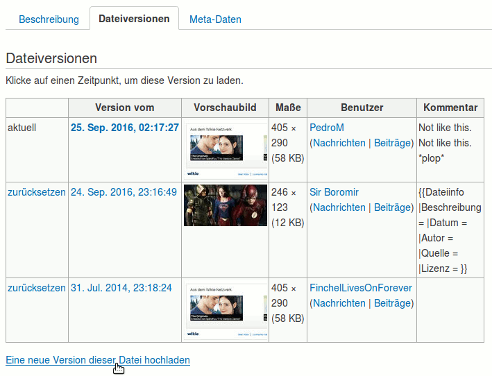Achtung: Wenn eine Datei auf den Namen einer bereits bestehenden hochgeladen wird, so wird die alte Datei ersetzt. Die alte Datei sieht man dann nur noch in der Dateien-Versionsgeschichte auf der Beschreibungsseite. Dateien sind da ein bisschen wie Vorlagen: Alle Einbindungen in Wikiseiten zeigen automatisch die zuletzt hochgeladene Dateiversion an.