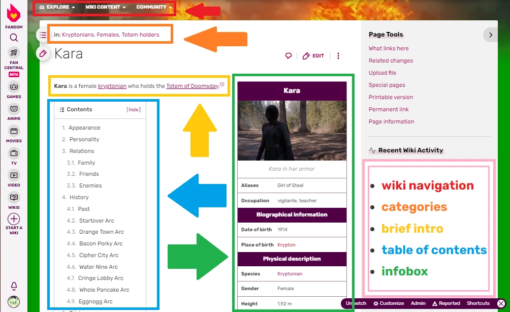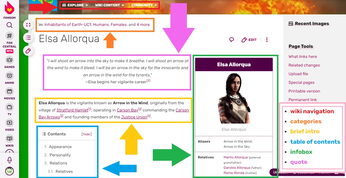 Tutte le sezioni sono importanti e dovrebbero essere il più esaustive possibile: la parte più lunga (e quindi la più ricca di informazioni) sarà quella sulla storia, generalmente suddivisa in ulteriori sottosezioni che distinguono il passato del personaggio prima degli eventi principali e le singole saghe o stagioni della trama in cui è apparso. Anche la personalità e le relazioni meritano di essere esplorate il più possibile: parlano del personaggio stesso e di come interagisce con gli altri, di come vedono e sono visti dagli altri personaggi. Questo vale principalmente per i media "passivi" come manga, anime, serie, film, ecc... Per argomenti come i videogiochi, le parti più importanti saranno quelle relative al gameplay, alle armi e armature, al sistema di combattimento e altre caratteristiche a cui un giocatore potrebbe essere interessato; non trascurate però la lore, che è sempre uno dei pilastri di un buon gioco. Quando consulti una wiki, vuoi principalmente accedere a informazioni che non riusciresti a conoscere limitandoti a leggere il manga, guardare la serie o giocare al videogioco: ecco perché parliamo di siti enciclopedici, giusto?
