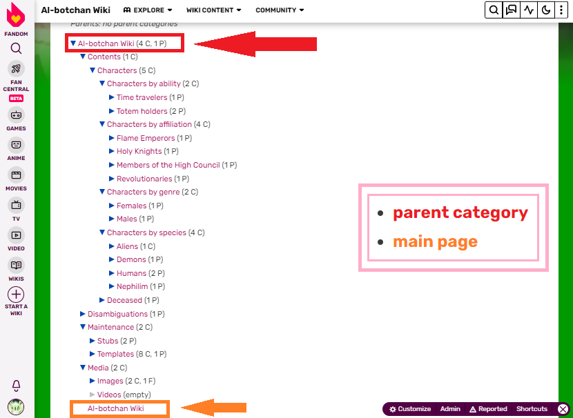 Ogni categoria deve essere categorizzata: cliccando su una categoria, finirai sulla sua pagina nel namespace Categoria:, dove categorizzerai la categoria stessa. Pensala come un albero genealogico che parte dalla categoria madre, si ramifica nelle sezioni (come "Contenuti") e si suddivide ulteriormente fino a raggiungere un sufficiente livello di specificità (ad esempio "Contenuti" → "Personaggi" → "Alieni" → "Kryptoniani"). Dovresti attenerti a specificità utili (come "Kryptoniani") e non entrare in dettagli eccessivi (come "Kryptoniani nati su Argo e cresciuti sulla Terra"). Dovresti anche evitare nomi di categorie troppo lunghi, cosa che si ottiene facilmente seguendo il punto precedente. Una pagina generalmente non dovrebbe avere una categoria quando ha già una sua sottocategoria: se, ad esempio, ha la categoria "Kryptoniani", non è necessaria la categoria "Alieni" perché è ridondante.