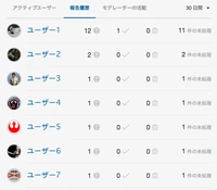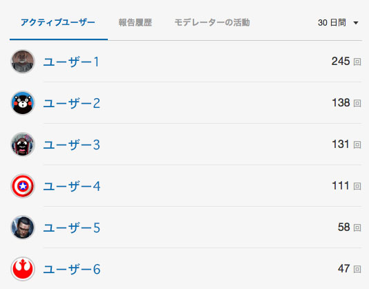 </figcaption></figure><p>ユーザーが報告した投稿や返信の数に応じてリストを表示します。また、報告された後、どのようなアクション(投稿の削除あるいは承認)が取られたかについても詳細が記載されます。こちらを使用することにより、アドミンはモデレーター候補を特定できるようになります。ユーザーの報告が悪質な投稿の削除につながったケースが多ければ多いほど、その方にコミュニティを維持する素質が備わっていることになります。逆に、問題ない投稿を何度も報告しているユーザーは、無意味に、または自分が気に入らないというだけで報告を行っていることになります。