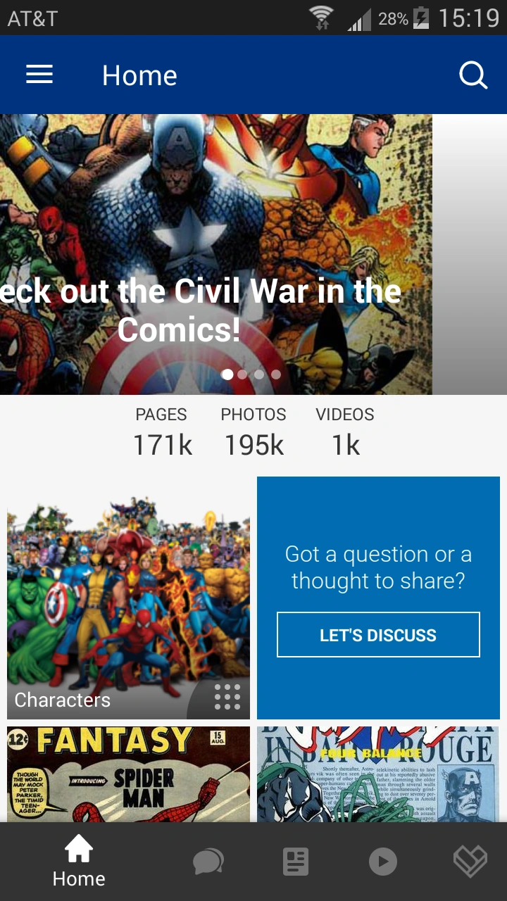 ホーム画面の上部には検索ボタン付きのバーがあり、Android版では、アプリメニューを開くボタンも表示されます。このアプリメニューを使用して、友達を招待したり、他のFandomコミュニティを見つけたり、アプリの設定を変更したりすることができます。