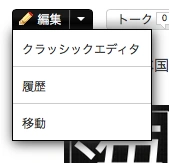 そのページに対して編集を行う際に使うメニューです。アイコンをクリックするとそのページの編集ができます。カーソルを合わせるとドロップダウンメニューが表示されます。
