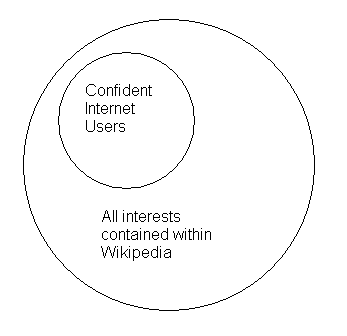 まず、ウィキペディアとFandomの大きな構造上の違いとして、ウィキペディアの場合は、百科事典という性格から、来訪者の関心の領域がウィキペディアのカバーする領域を大きく出ることがないのに対して、Fandomの場合、個々の関心と来訪者の関心が必ずしも一致しないというのがあります。簡単な図にすると、こんな感じです。
