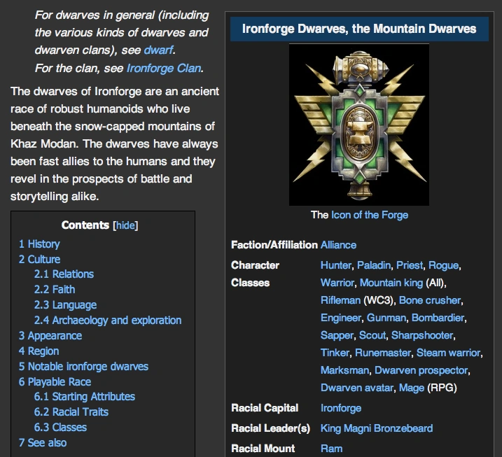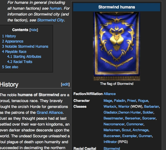 また、テンプレートは、テーブル状に組んだり、中に引数を含むこともできます。これを利用すると、人物に関する記事や、ゲームのアイテムに関する記事など、同じ要素を持つものに対して同じ要素を使って表現することができるようになります。例としては、英語版wow wikiの、ゲーム中の種族(キャラクターの種類)の記事(1、2)があげられます。これらふたつは、ゲーム中の同じ要素を扱っているため、そのタイプなど同じ要素を含みます。そこで、両方とも右側に同じ形のテーブルを用意して、画像や、同じ要素を併記するようにしています。こうすることで、記事中で同じことを繰り返し言及することなく、簡単に、かつわかりやすく記事の内容を表現することができます。