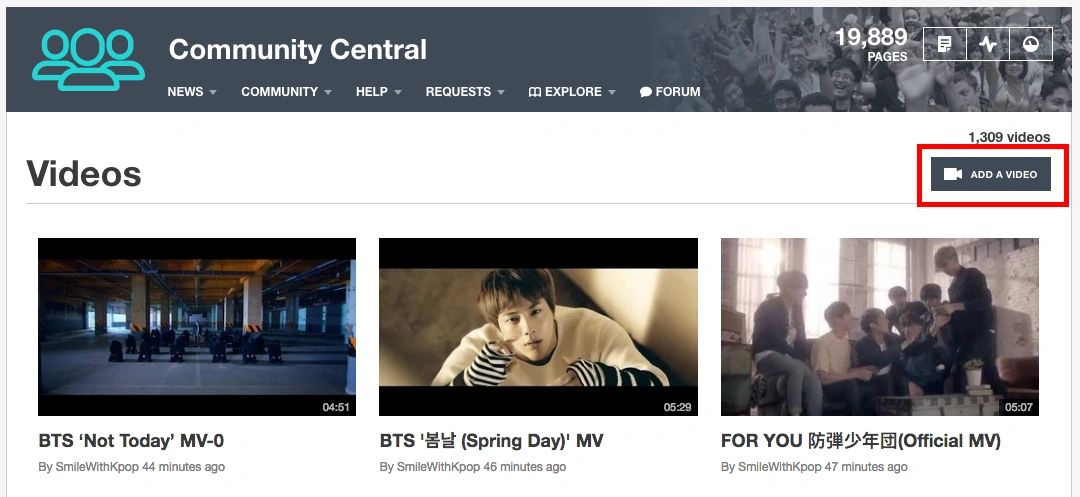 現在特別:動画ページ等は存在しないため、下記手順に従った動画追加は不可能です。特別:新着ファイルか特別:アップロードから追加下さい。ただし、許可されたファイル形式である、webm、ogvの動画形式を始め、odm、ogg、oga、flac、opus、wav、mp3等々も、スマホ・モバイル(Android、iPhone)環境化でバグがあり、正常に表示・動作しないことを確認しました。そのためバグのあるFandomの表示機能の使用は避け、安定動作が確認されているYoutube等の外部サイト経由のアップロードが、ユーザビリティの観点からは推奨されます。