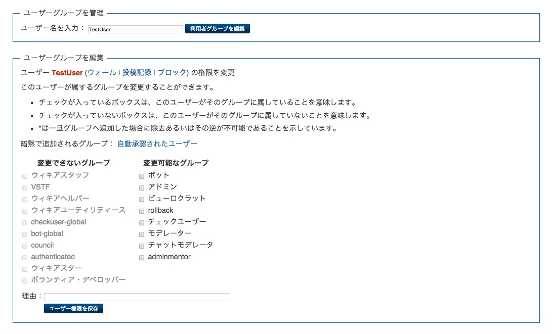 - ユーザー名を入力し(大文字小文字の区別が必要です)「ユーザーグループを変更」をクリックすると、右の画像のようなフォームが表示されます。