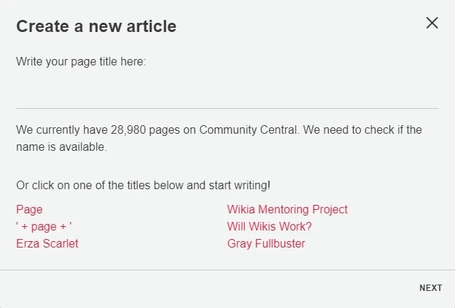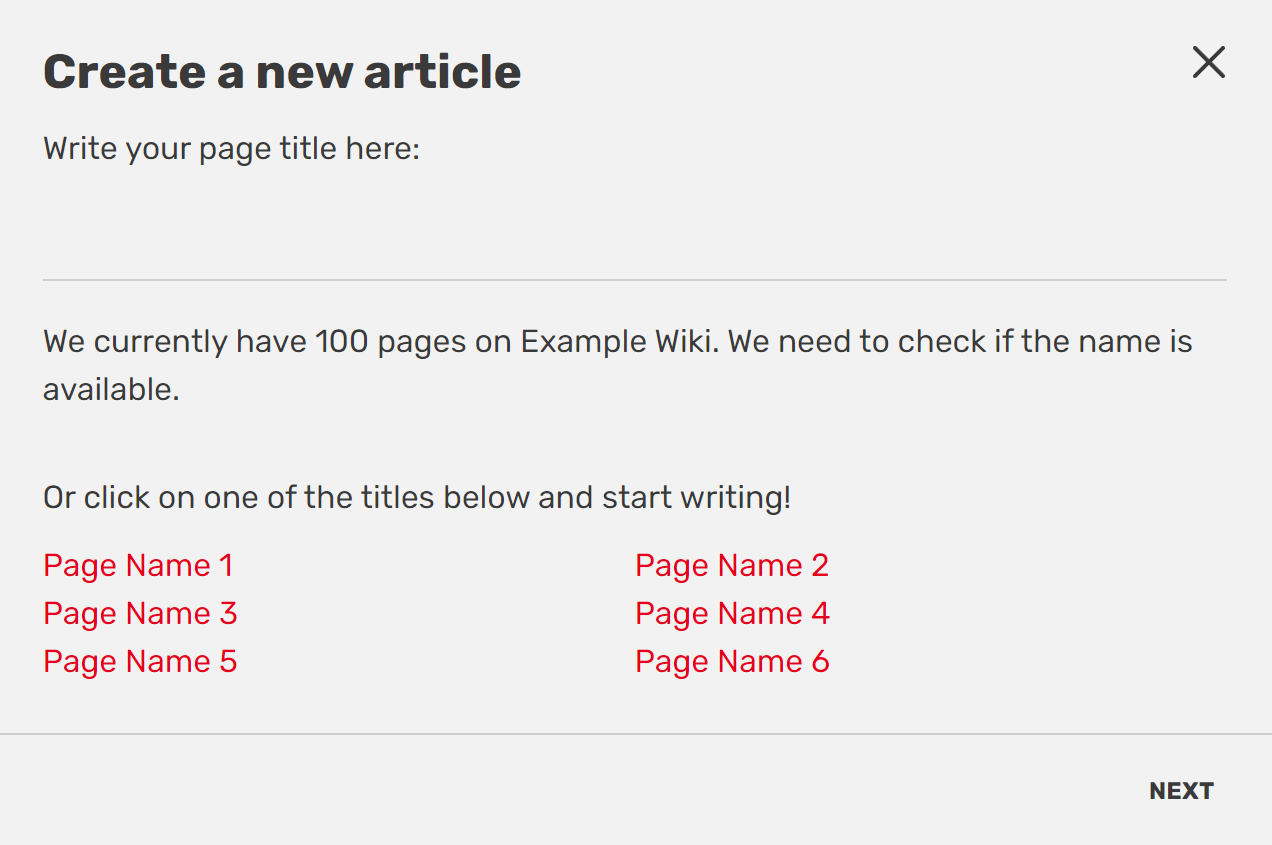 - You can choose the article name by typing it in the box. This name will become the last part of the page's URL. You will also be given suggestions to create pages that are linked to but do not yet exist, or pages that did exist but got deleted, known as "wanted pages".