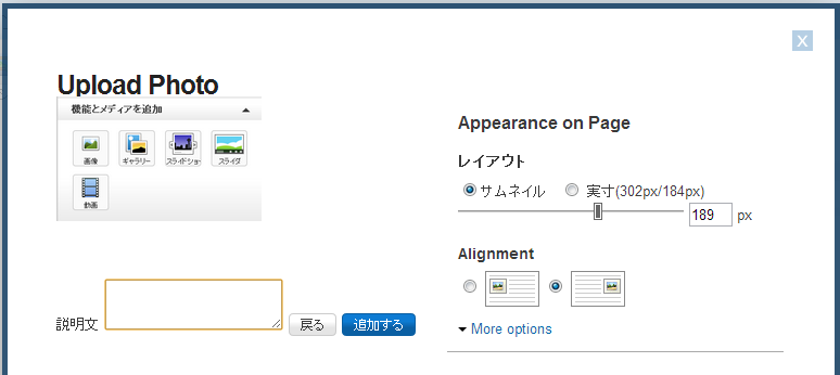 - そして、「レイアウト」から写真のサイズと配置を調整します。写真の下に表示される「説明文」(キャプション)を追加することもできます。