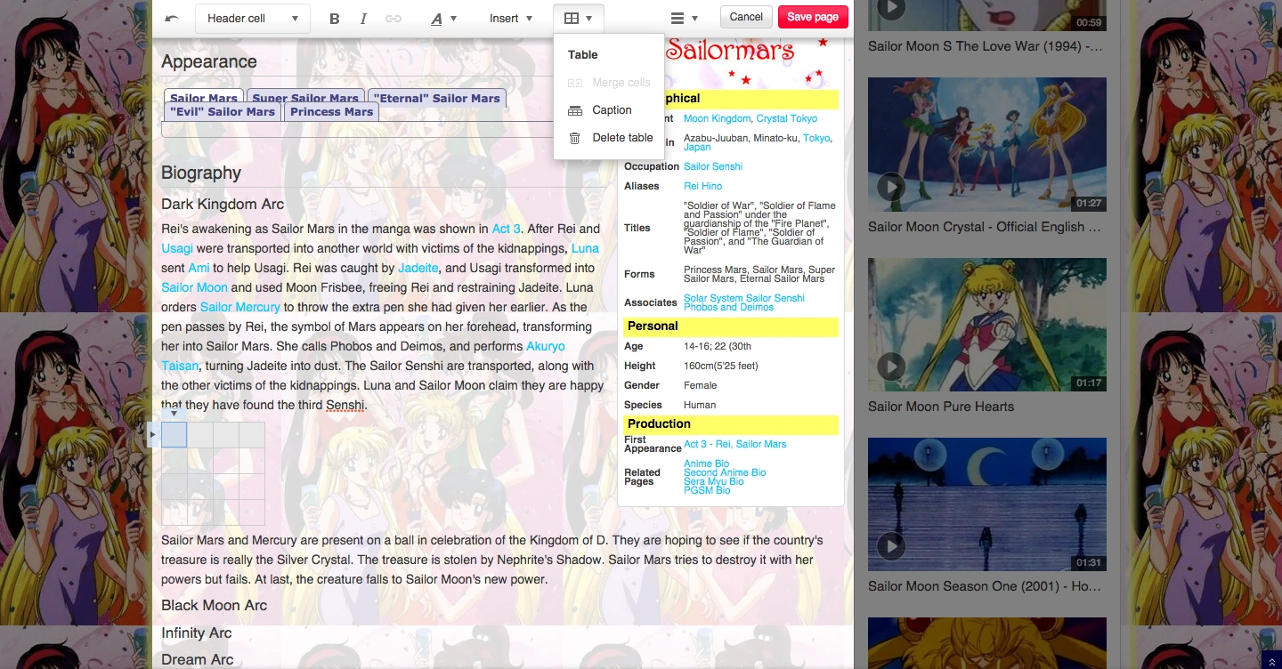 そして、この新しいビジュアルエディタ内にはテーブルのツールも備わりました。この機能はとても使いやすく、皆さんに楽しんでいただけるのではないかと思います。ウィキアではテーブルが大好きなユーザーさんを多く見かけるので、この機能によって人気のツールがより使いやすくなることを願っています。