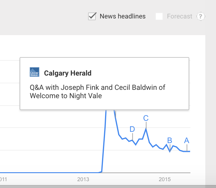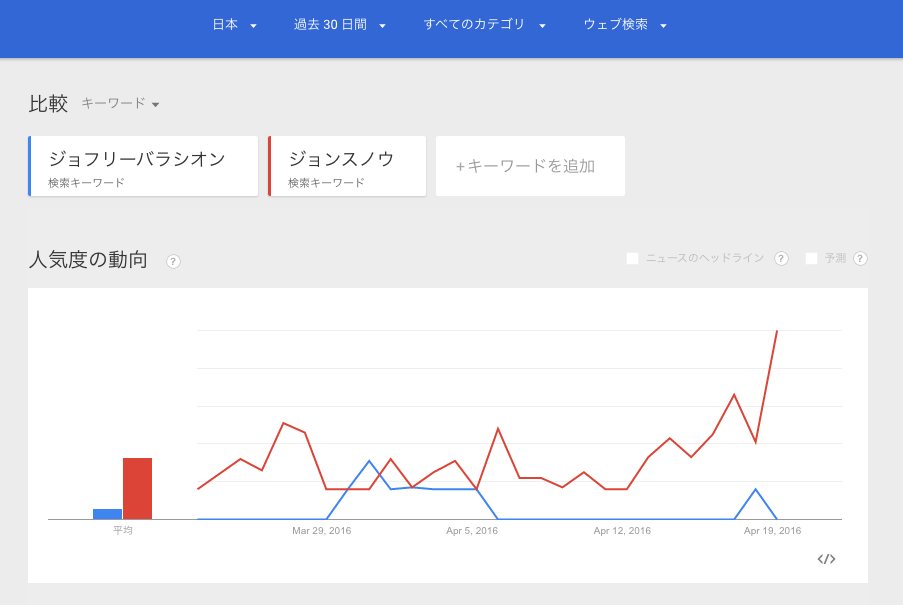 これを見ると、ゲーム・オブ・スローンズのキャラクター2人について調べたこの例だと、「ジョフリー・バラシオン」に関する検索よりも、「ジョン・スノウ」の検索の方が多いことが分かります。