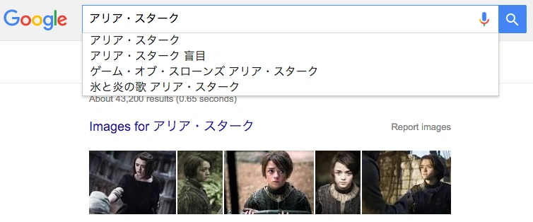 既存のアリア・スタークの記事の内容を増やしたいと考え、Googleサジェストを使う場合、出てきたキーワード・フレーズ(またはロングテール・キーワード)を見ると、追加もしくは編集するべき箇所が明らかになります。