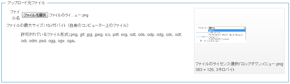 その下の「ライセンス」の項目では、ファイルのライセンスを指定することもできます。何も指定しなくてもアップロードできますが、さきほど説明したように、ライセンス指定の必要性があるときは、ここでも指定できます。