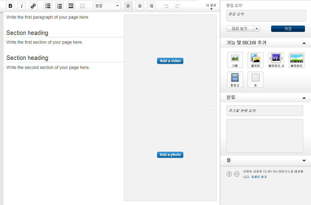 - 기본 레이아웃과 빈 문서 중에서 하나를 선택할 수 있습니다. 기본 레이아웃에는 그림, 동영상 공간과 문단이 포함되어 있습니다. 이 레이아웃의 내용은 “미디어위키:Createpage-with-video”에서 관리자가 수정할 수 있습니다.