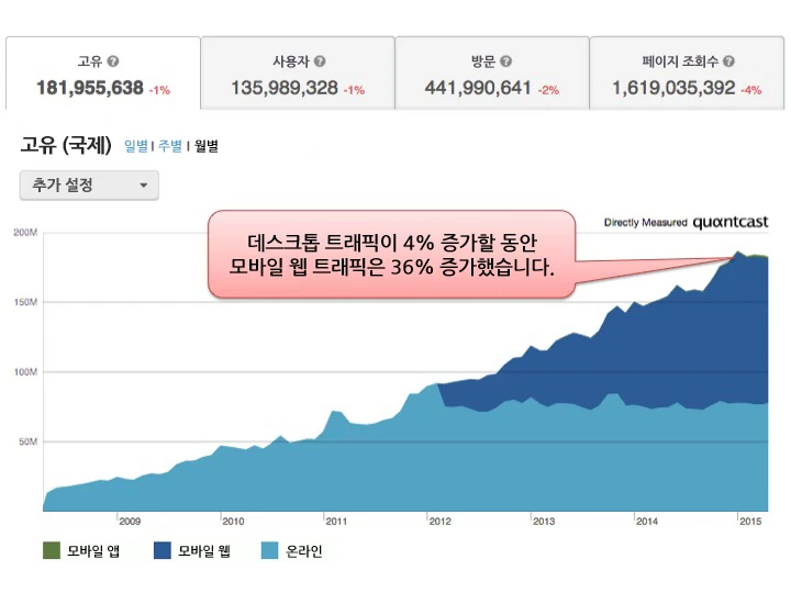그리고 아래 그래프를 보시면 모바일의 비중이 눈에 띄게 증가하는 것을 보실 수 있습니다. 이것은 즉, 위키아에서 모바일을 사용하는 사용자들이 매우 늘어나고 있다는 뜻입니다. 이러한 현상은 비단 위키아뿐만 아니라 거의 모든 인터넷 사이트에서 일어나고 있는 현상입니다.