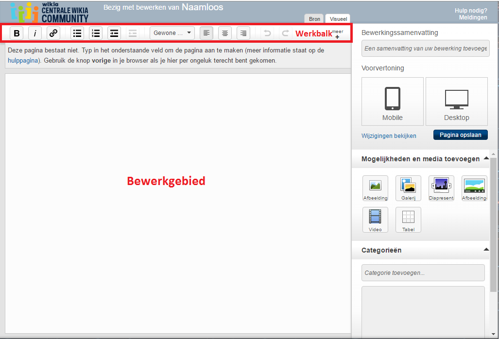 | Fandom's klassieke rijke tekstverwerker | Weergeeft de klassieke rijke tekstverwerker indien mogelijk. Indien dit niet het geval is, wordt de broncodemodus weergegeven. |