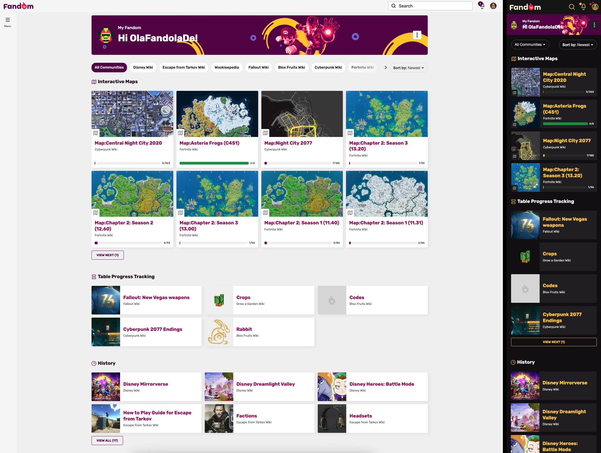 Функция отслеживания прогресса уже довольно давно доступна участникам на интерактивных картах, а недавно она появилась и в таблицах. Однако проблема в том, что вы можете использовать её только на конкретной странице вики. Если же вам необходимо следить сразу за несколькими страницами с картами и таблицами, а если они находятся на разных википроектах, то возникают трудности с быстрым доступом к таким страницам и навигацией. Поэтому мы сделали портал Мой Фэндом, где собрали для вас все страницы, которые вы используете для отслеживания прогресса, и не только.