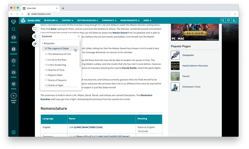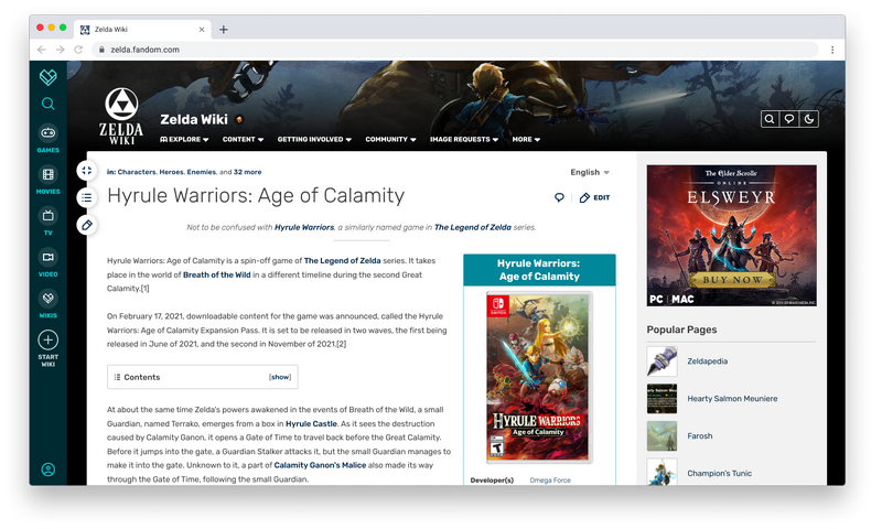 На изображении выше вы видите то, как выглядит страница Zelda Wiki для анонимных пользователей в новом дизайне. Zelda Wiki - это объединённое сообщество, которое сейчас находится на Gamepedia. В новом дизайне появится специальная кнопка в верхнем левом углу страницы, с помощью которой можно переключать ширину страницы. Вы сможете использовать узкую страницу для чтения и ширину почти во весь экран для лучшего представления контента.