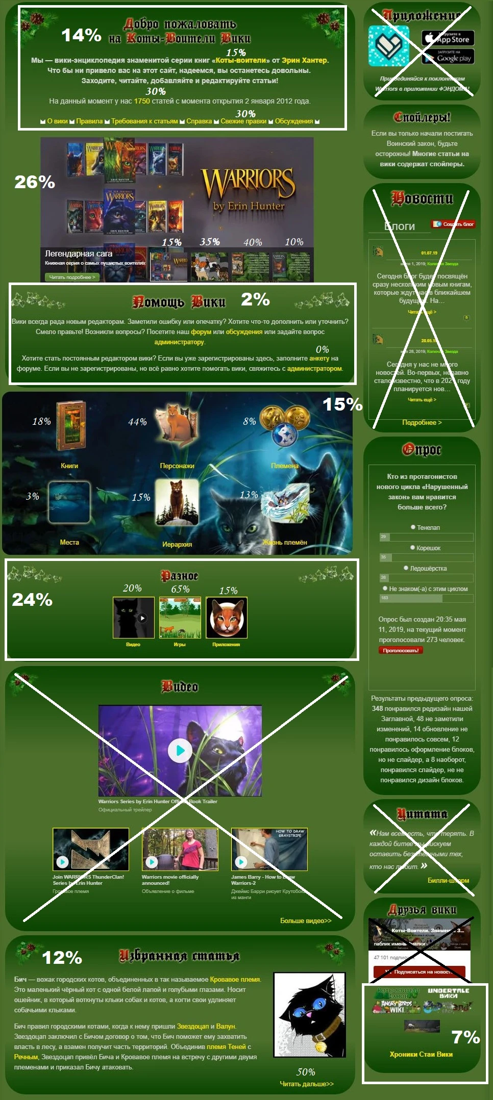 На изображениях ниже вы можете увидеть процент популярности отдельных блоков Заглавной для каждой вики (белый полужирный шрифт), а также некоторые цифры популярности отдельных элементов внутри этих блоков (белый курсивный шрифт).