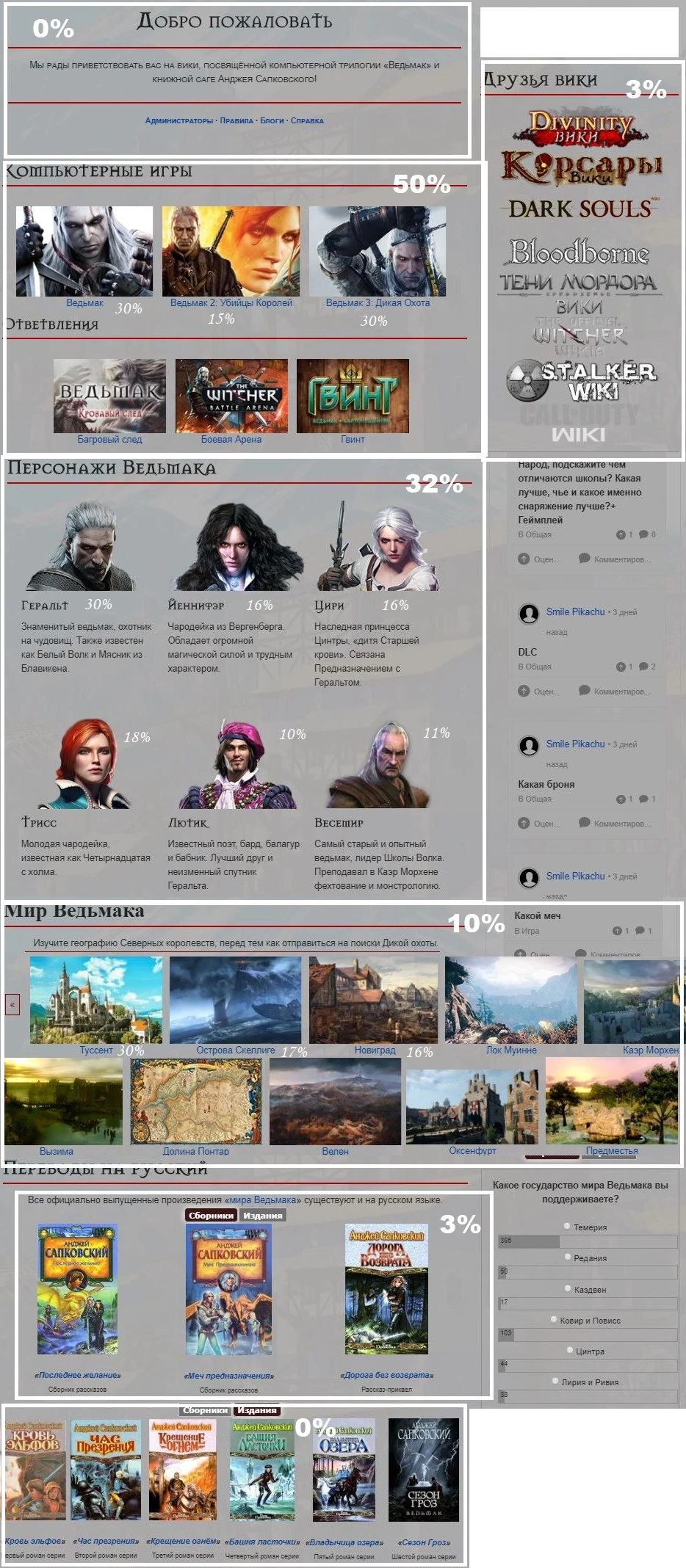 В качестве примеров для обзора мы взяли Заглавные страницы Ведьмак вики и Коты-воители вики. Они разные, но вместе имеют все востребованные блоки Заглавной, которые используют на большинстве википроектов.