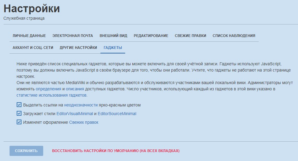 Участники вики могут включать и отключать гаджеты, используемые на вики, на отдельной вкладке страницы личных настроек.