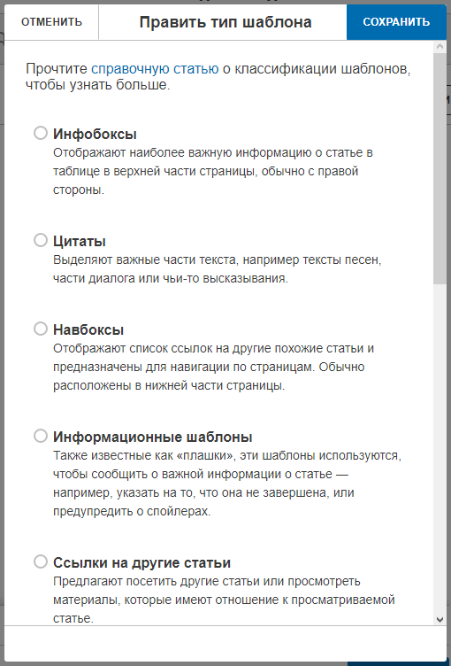 Текущий тип шаблона указан под названием шаблона. Этот тип может изменить любой участник, который имеет право редактировать страницу.