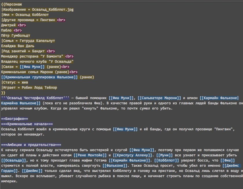 Викитекст — это основа любой статьи вики. Даже при редактировании в Визуальном редакторе ваши правки в конечном итоге будут преобразованы в викитекст. Но на больших страницах с многочисленными шаблонами и сложными конструкциями бывает сложно сразу разобраться, что есть что. Подсветка синтаксиса призвана решить эту проблему.
