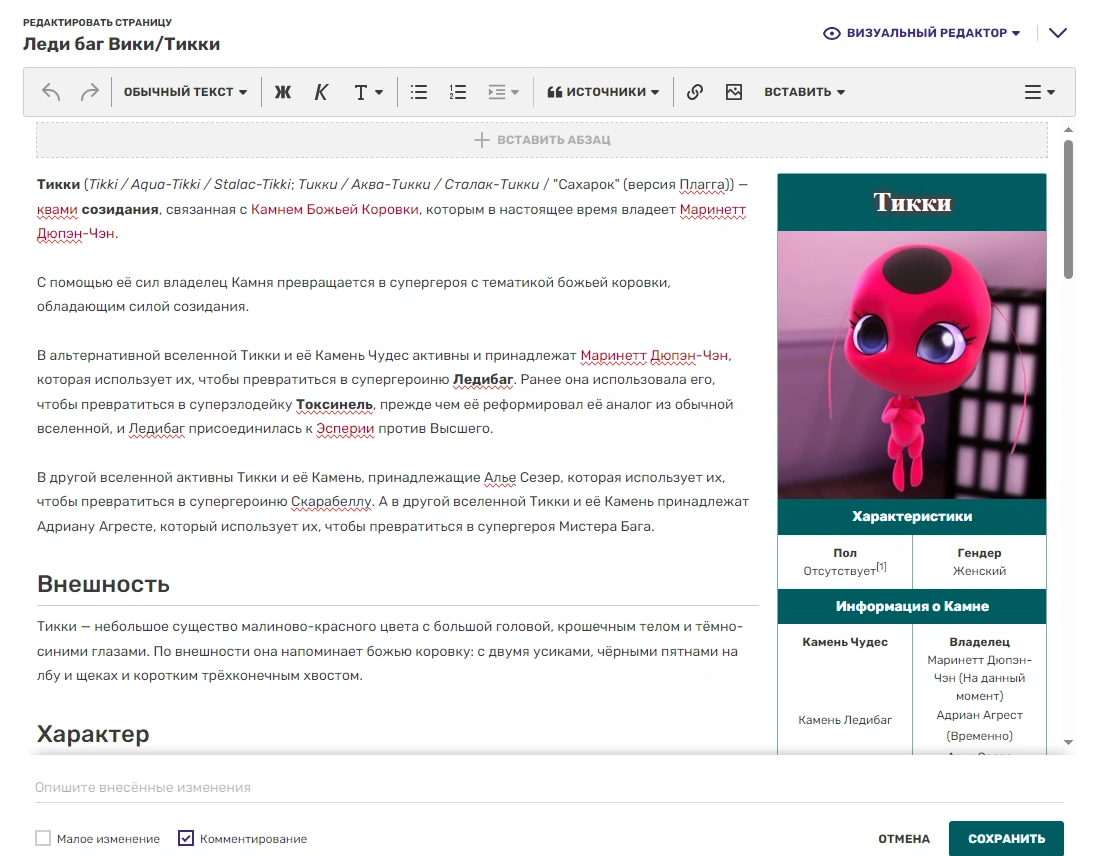 Редактирование — это основа любой вики. С помощью встроенного редактора вы можете исправить ошибки в статье, добавить новую информацию, изображения или видео, отформатировать текст на странице. Чтобы перейти к редактированию искомой страницы, нажмите кнопку «Править» в правом верхнем углу страницы.