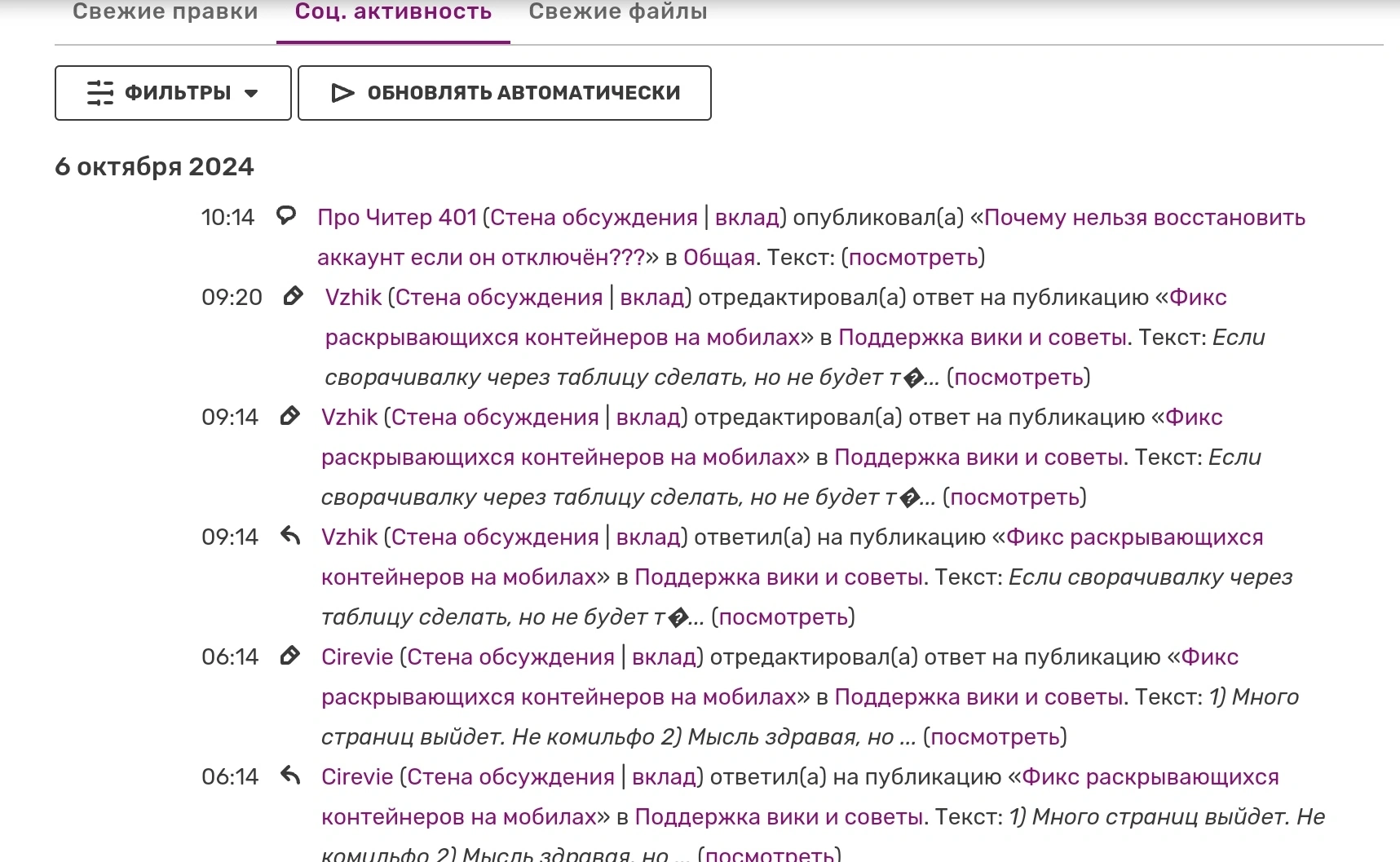 В ленте отображаются следующие действия от участников на вашей вики, в хронологическом порядке (от новых к старым):