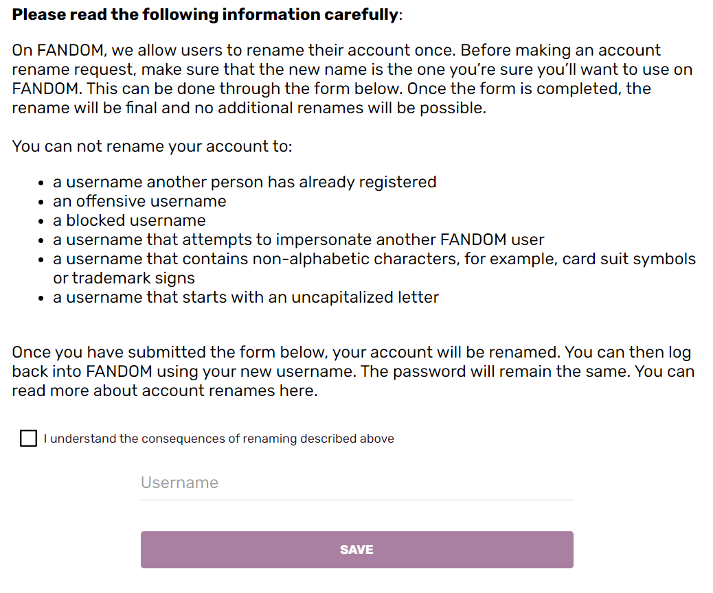 On Fandom, you are allowed to change your username. This can be done once and only once. Therefore, it is very important to be sure your new name is the one you want to be called, and that the username is not already taken.