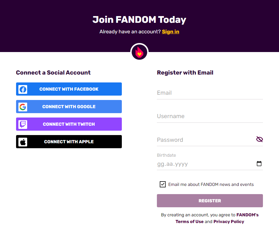 Creating an account on Fandom is free, easy, and a great way to join a passionate community of people who love what you love. Having an account also gives you extra abilities and features to which unregistered users do not have access. Your account is used for every wiki, so you only need to create it once, and you will be able to log into every Fandom community.