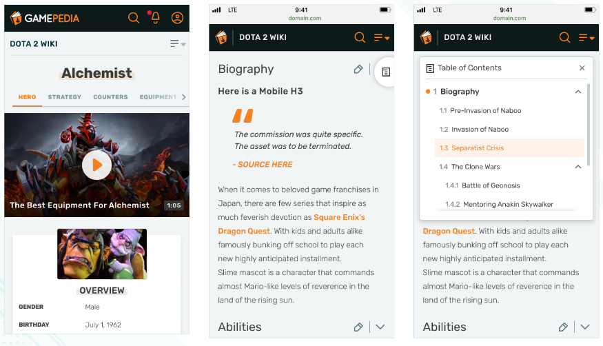The Growth and Design teams poured over these options and ended up selecting option 3, as it increases the utility of the ToC for navigational purposes while also making it more accessible to users as they read. Fandom used to have ToC on mobile and we’re bringing it back because it’s a great usability enhancement.