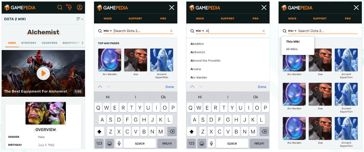 For the global navigation, we wanted invoking the search bar to be more than just search, but also invoke discovery options for what’s relevant on the particular wiki and the platform as a whole. The use cases we solved for were searching wiki content, discovering wiki content, and accessing global links. There were two options presented, the one you see above, which displays global links above the search bar and discovery options below it, and a second one which displayed a panel of global links underneath search before discovery options. The option we chose was the sleeker of the two and most respected the user’s intent, which was to search the wiki. You might notice the This Wiki vs All Wikis toggle in there. Our search tests concluded that offering this toggle was a good user experience, but we’re still collecting data and feedback about what its exact functionality should be. For now, it defaults to This Wiki for everyone.