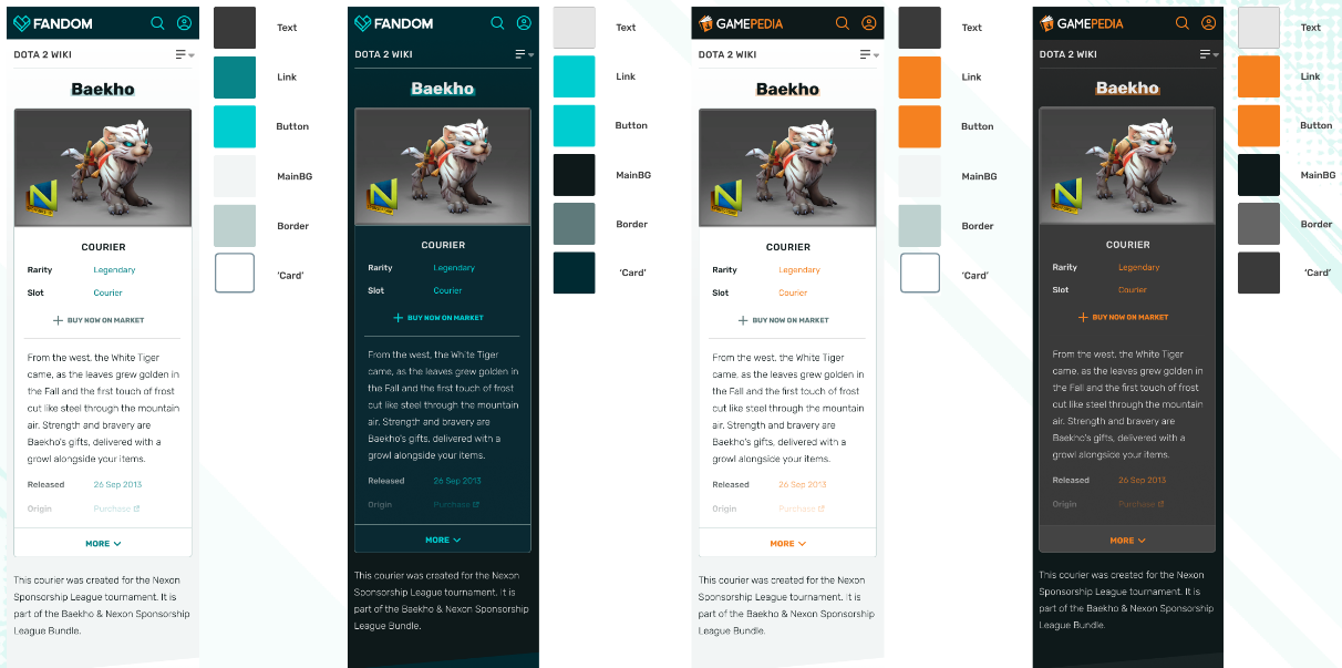 Let’s dive into some design mockups. Please note that these are not representative of the final implementation, were created in a design software with hilariously mismatched placeholder content from Gamepedia, and were captured before the beta test in December went live. Production screenshots from Fandom will follow.