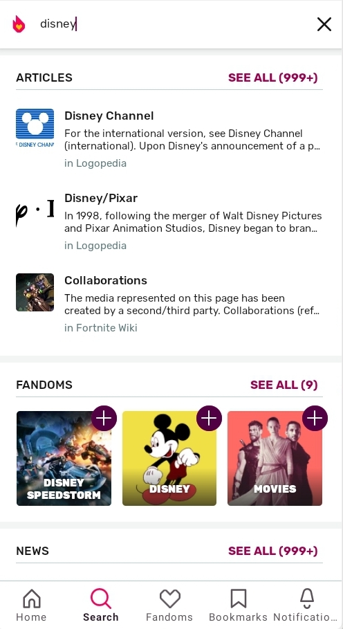 The search view allows you to search for content from all of Fandom, including wiki articles, fandoms, and news articles. The article results include wiki articles from all wikis, not just wikis with fandom topic cards in the app. However, the news results do not include curated content from non-Fandom sources.