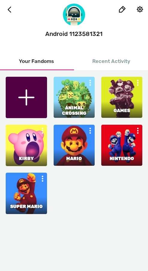 Below your profile is a list of your followed fandoms. You can tap any of the cards to visit the fandom, the menu button to unfollow the fandom, or the plus icon at the top of the list to add more fandoms from the fandoms view.