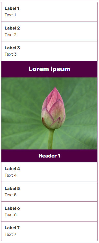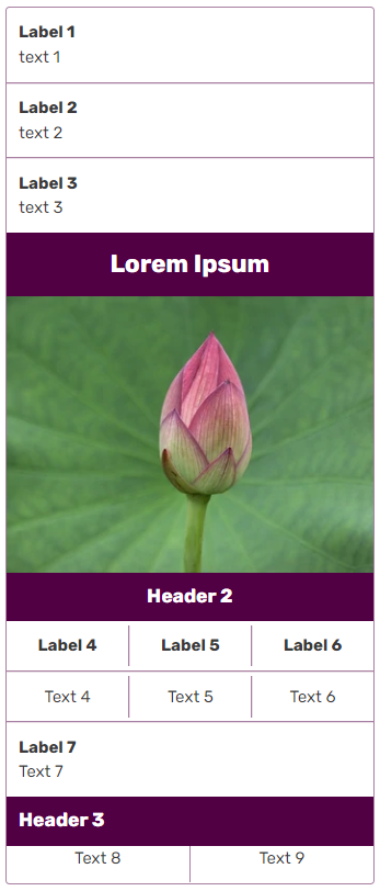 The <group> tag will let you group fields together and give them a header. Remember: fields that are declared but don't have a value won't appear. This rule also applies to groups. If none of the fields (other than the <header> tag) inside a group have a value, that whole group won't show up.