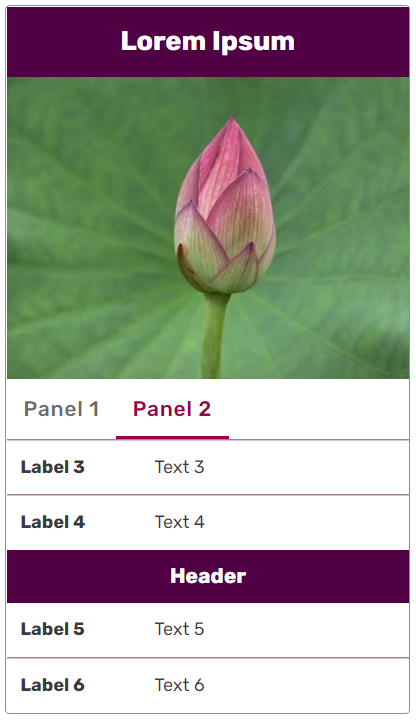 The changeable area is formed from two tags: the <section> tag represents the contents of a tab. Inside it, the <label> tag indicates what text to put on the clickable toggle. Labels default to their zero-based index if omitted; but if all tabs within a panel are unlabeled, then they are contained in the infobox as if they were groups.