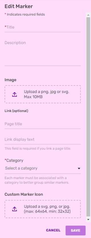 - Category: Select which category you would like your marker to be grouped in. Each marker must be associated with a category to better group similar markers.
