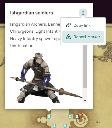 Logged-in users can report a marker by clicking the three vertical dots (⋮) on the marker pop-up and selecting the "Report Marker" button. A successful report is indicated by a banner notification in the bottom left corner, and the "Report Marker" option in the menu will change to "Already Reported". This is only visible to the user who reported that marker. A previously dismissed marker cannot be reported again by the same user as long as the reports have not been cleared from Special:Reports. Trying this will result in the error message "There was a problem reporting this marker. Please try again."