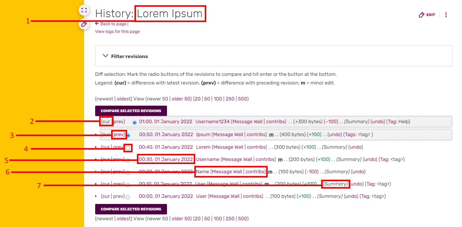 - The two columns of radio buttons can be used to select any two versions of the page for comparison. The most recent version of those selected is shown below the comparison.